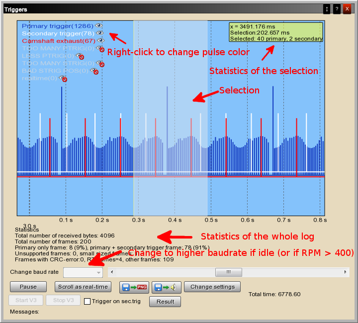 Triggerlog is mostly used to analyze input triggers during cranking. Use higher baudrate for idle and higher RPM, especially important with 60-2 trigger (low baudrate can be misleading: some teeth might appear missing).