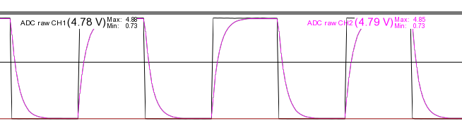 Example squarewave signal fed into 2 analog channels to compare non-filtered ch1 against ch2 having agressive filtering applied: