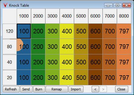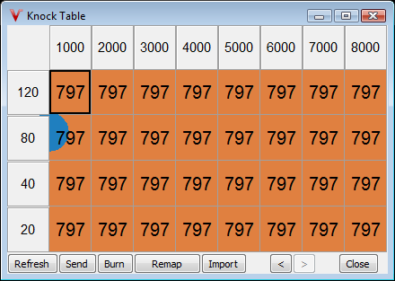 - If desired you can fill area where knock detection is not desirable with 797 to disable detection in those area's usually overrun/low map or idle