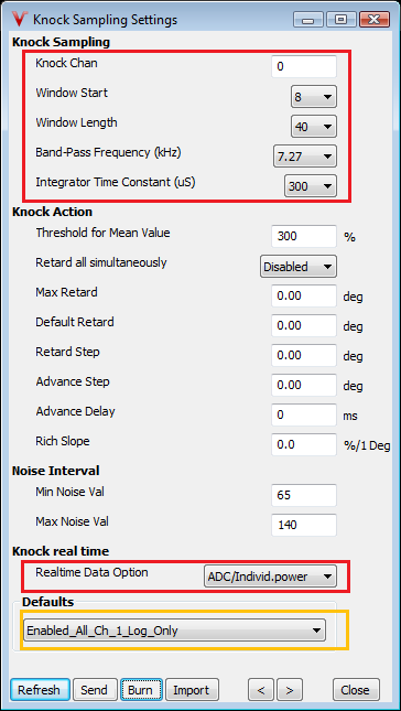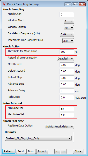 Knock Integrator Time Constant (uS; takes effect after burn and ECU reboot): Works as an amplifier, we will use this together with channel gain setting to get our reference measurement setting correct. Larger time constant results in lower knock reading.