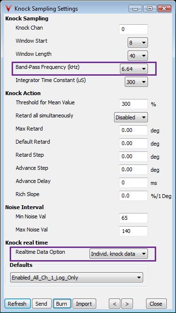 Knock Band-Pass Frequency (kHz): The center frequency of the knock band pass filter, this should be set to the calculated knock frequency of your engine (see frequency bandpass filtering section for